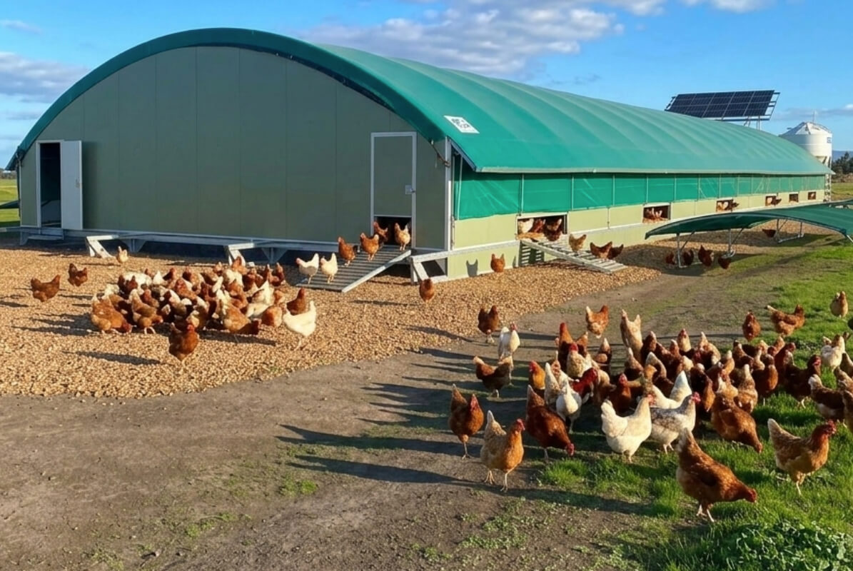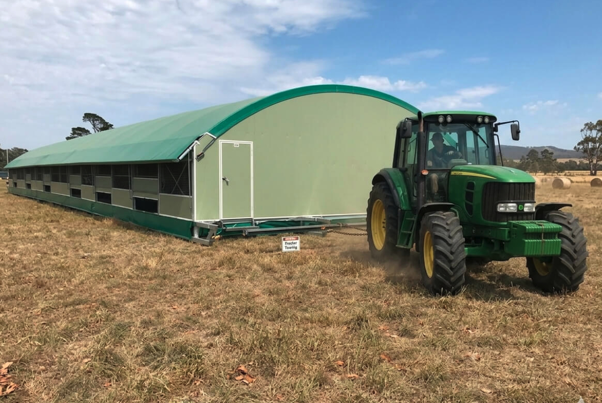 Our mobile shelter range is designed towards the free range chicken industry. This shelter can be easily relocated from paddock to paddock using machinery attached with a tow hitch to support truly ethical free range farming.